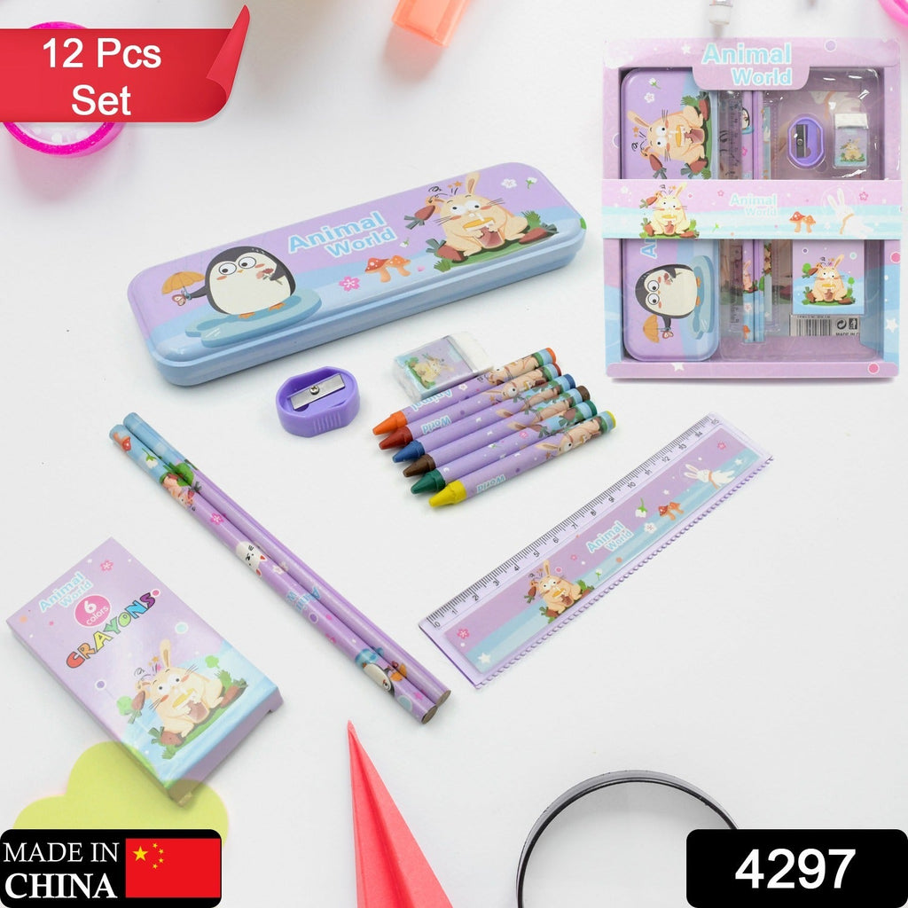 4297 School Supplies Stationery Kit with 1 Pencil Box Case 2 Pencils 6 Crayon Colors 1 Ruler Scale 1 Eraser 1 Sharpener Stationary Kit for Girls Pencil Pen Book Eraser Sharpener Crayons - Stationary Kit Set for Kids Birthday Gift (12 Pc Set)